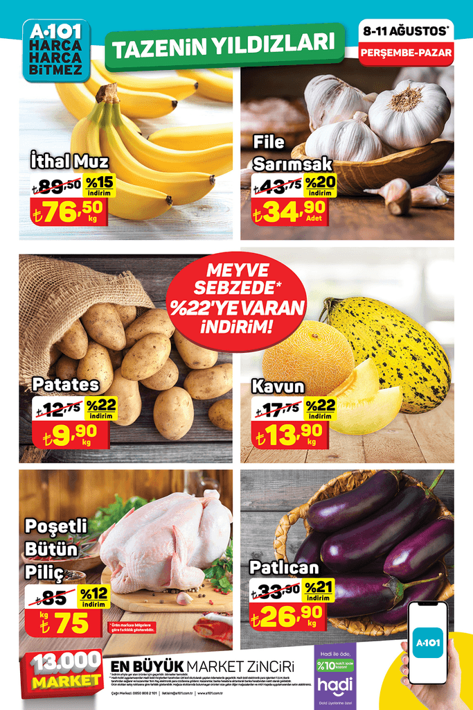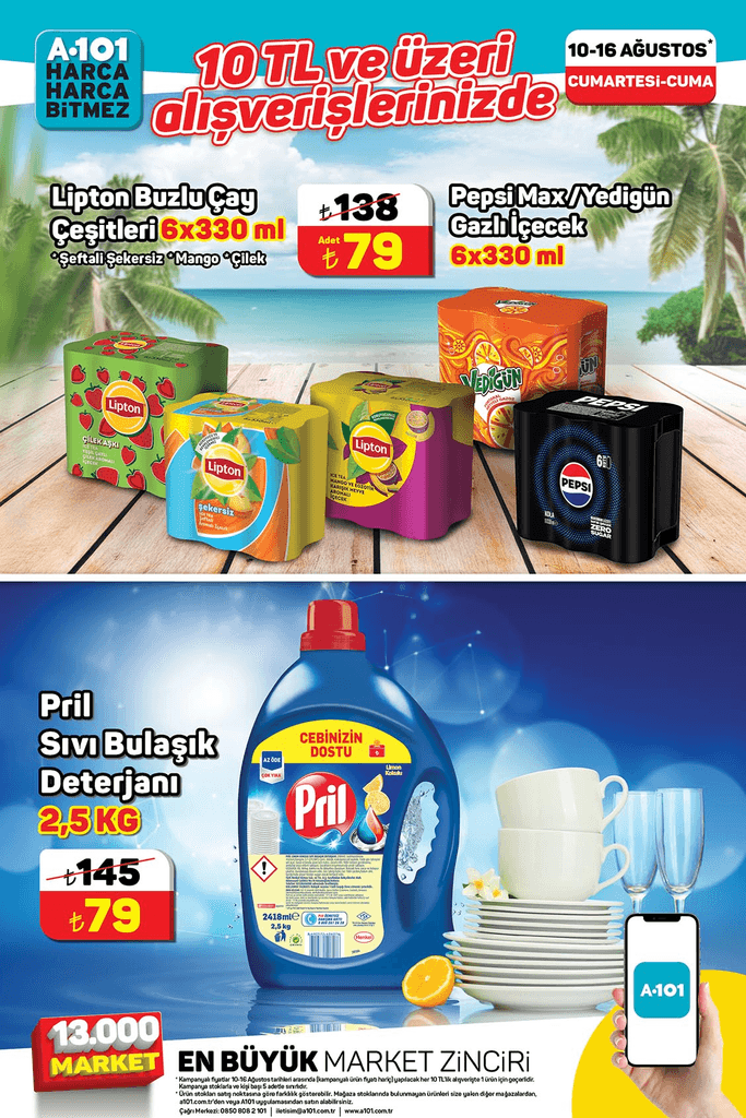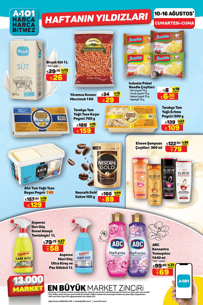 A101 10 Ağustos 2024 aktüel ürünler kataloğu yayınlandı. A101 Market mağazalarında 10 Ağustos ile 16 Ağustos 2024 tarihleri arasında geçerli olacak kampanyada yer alacak aktüel ürünler belli oldu. A101 10 Ağustos 2024 Cumartesi Haftanın Yıldızları kampanyasında hangi ürünler yer alacak hemen inceleyelim.10 Ağustos A101 Market kampanyasında ilk dikkat çeken aktüel ürün Ahir Tam Yağlı Taze Beyaz Peynir 1KG oluyor. A101 10 Ağustos 2024 kataloğunda Tarabya Tam Yağlı Eritme Peyniri 500 g için 109 TL, Birşah Süt 1L: 26 TL, Yöremce Kırmızı Mercimek 1 KG: 29 TL, Tarabya Tam Yağlı Taze Kaşar Peyniri 700 g: 159 TL, Tarabya Tam Yağlı Eritme Peyniri 500 g: 109 TL, Ahir Tam Yağlı Taze Beyaz Peynir 1KG: 157.50 TL,Nescafé Gold Kahve 100 g: 89 TL, Indomie Paket Noodle Çeşitleri: 15 TL fiyat görüyoruz. A101 10 Ağustos 2024 kataloğunda yer alan diğer aktüel ürünlere de hemen bakalım.A101 Aktüel 10 Ağustos kataloğunda Elseve Şampuan Çeşitleri 360 ml: 79 TL, Parfumia Çeşitleri: 460 TL, ABC Konsantre Yumuşatıcı 1440 ml: 69 TL, Asperox Mavi Güç Ultra Kireç ve Pas Sökücü 1L: 60 TL ve Asperox Sarı Güç Genel Amaçlı Temizleyici 1L: 79.75 TL haftanın dikkat çeken aktüel ürünleri arasında yer alıyor. A101 10 Ağustos 2024 Aktüel Ürünler Kataloğu ile bu hafta gelecek tüm ürünlere sayfanın devamından ulaşabilirsiniz.A101 16 Ağustos 2024 kampanyasına kadar geçerli olacak A101 10 Ağustos 2024 Kataloğu ile gelecek ürünlerden öne çıkanları sizlere sunduk. Gelecek hafta Aldın Aldın kampanyasında A101 10 Ağustos 2024 Aktüel Kataloğu incelemesi yine sitemizde A101 Aktüel kategorisi altında yer alacak.