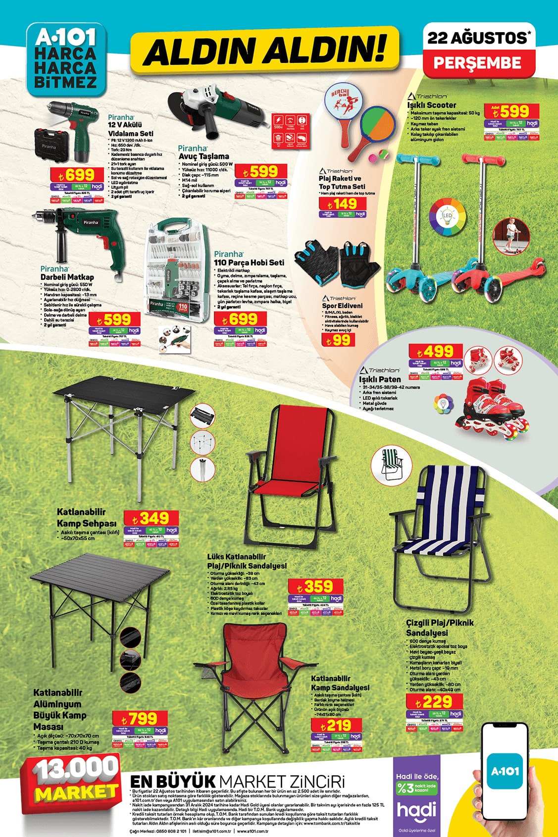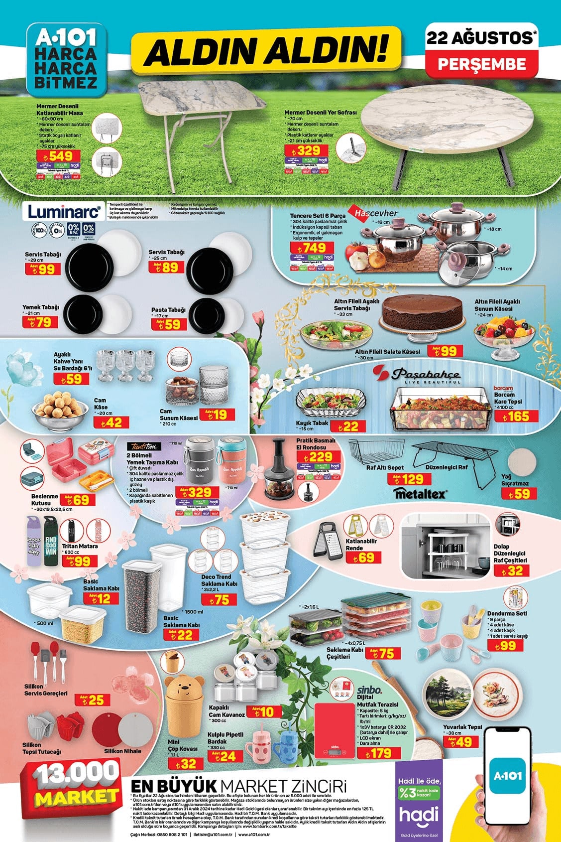 Yukarıda listelediğimiz ürünler ile birlikte 22 Ağustos ile 29 Ağustos 2024 tarihleri arasında geçerli olacak A101 22 Ağustos 2024 Kataloğu incelememizi tamamladık. Bu kampanyaya ait görsellere hemen aşağıdan ulaşabilirsiniz. Gelecek hafta sonu kampanyası A101 29 Ağustos 2024 İndirim Katalogu incelememizde görüşmek üzere…