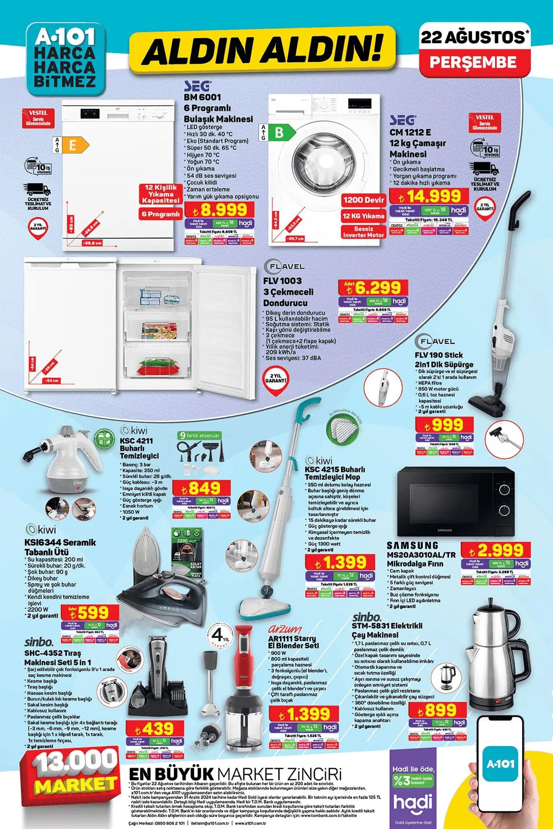 A101 22 Ağustos 2024 hafta sonu aktüel kampanya kataloğu yayınlandı. A101’de bu hafta sonu 22 Ağustos ile 29 Ağustos 2024 tarihleri arasında geçerli olacak kampanyada yer alacak indirimli ürünler belli oldu. 22 Ağustos A101 Kataloğu ile hangi ürünler gelecek hemen bakalım. 22 Ağustos A101 Market kampanyasında ilk dikkat çeken aktüel ürün Volta VSM Elektrikli Motorlu Bisiklet oluyor. A101 22 Ağustos 2024 kataloğunda Volta VSM Elektrikli Motorlu Bisiklet için 16.990 TL fiyat görüyoruz. A101 22 Ağustos 2024 kataloğunda yer alan diğer aktüel ürünlere de hemen bakalım. A101 Aktel 22 Ağustos kataloğunda Toshiba 65″ Ultra HD 4K Smart Led Tv, Kiwi Buharlı Temizli Mop, Arzum Starry El Blender Seti, Samsung Mikrodalga Fırın ve Sinbo Elektrikli Çay Makinesi haftanın dikkat çeken aktüel ürünleri arasında yer alıyor. A101 22 Ağustos 2024 Aktüel Ürünler Kataloğu ile bu hafta gelecek tüm ürünlere sayfanın devamından ulaşabilirsiniz.