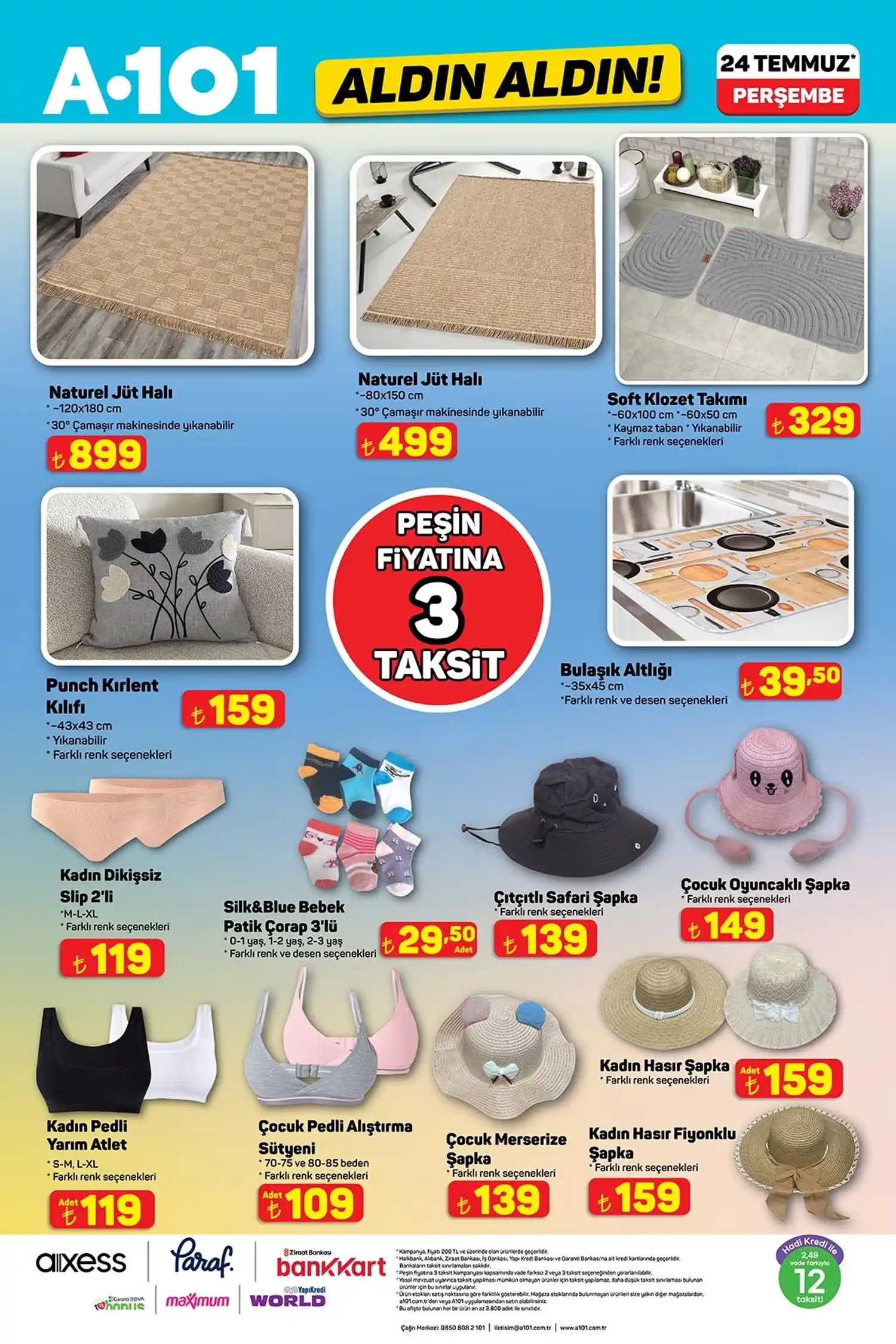 A101 24 Temmuz 2025 Aktüel Kataloğu ile Temmuz dönemi haftalık indirim kampanyalarına harika ürünlerle bir yenisini daha ekleyen A101 Market Aldın Aldın etiketi ile hazırladığı A101 Aktüel Kataloğu karşınızda. işte tüm ürünlerde peşin fiyatına 3 taksit fırsatı içeren bir aktüel ürünler kataloğu.