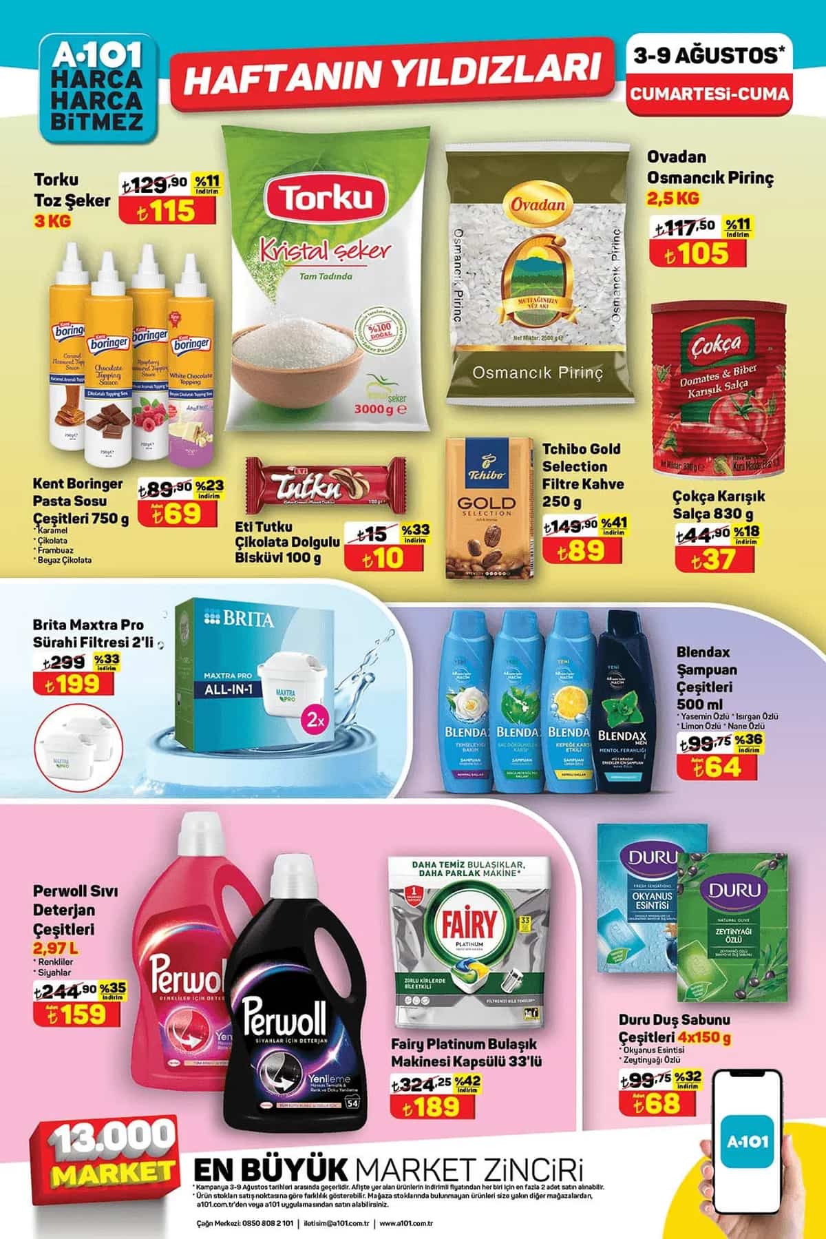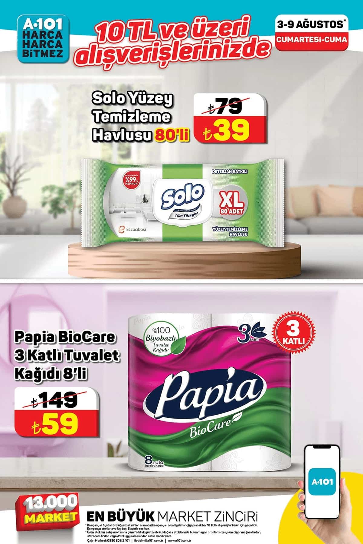 A101 Haftanın Yıldızları kampanyasında Perwoll Sıvı Deterjan Çeşitleri, Blendax Şampuan Çeşitleri, Torku Toz Şeker ve Fairy Platinum Bulaşık Makinesi Kapsülü gibi ürünlerde indirimli fiyatları görüyoruz. A101 3 Ağustos 2024 Aktüel Ürünler Kataloğu ile bu hafta indirimli olarak satışa sunulacak tüm ürünlere sayfanın devamından ulaşabilirsiniz. A101’de bu hafta yapacağınız 10 TL üstü alışverişlerde 8’li Papia BioCare 3 Katlı Tuvalet Kağıdı için 149 TL yerine 59 TL veı 80’li Solo Yüzey Temizleme Havlusu için ise 79 TL yerine 39 TL indirimli fiyat sunulacak.