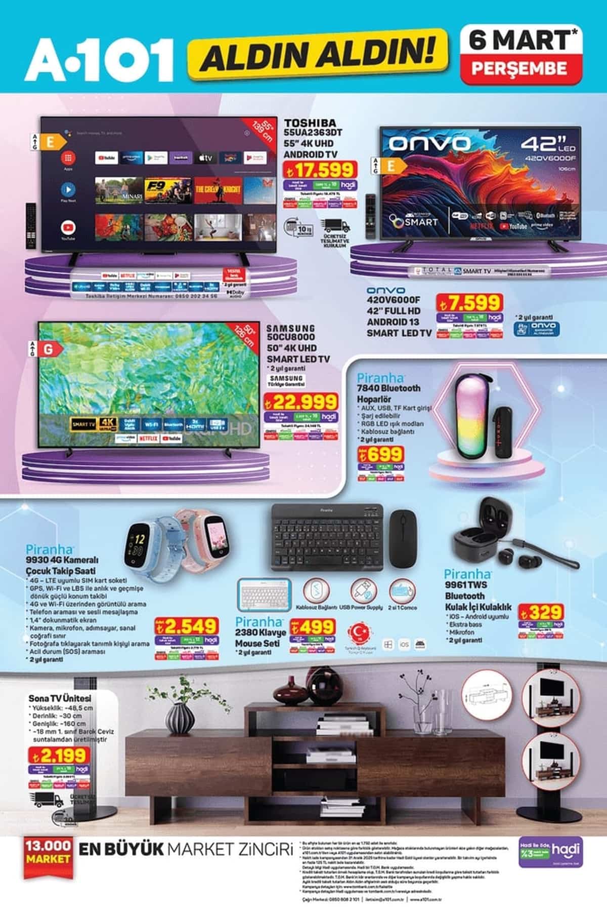 A101 Aktüel Ürünler listesinde 6 Mart 2025 Perşembe tarihli kataloğu kampanyaları içinde yer almış olan Teknoloji ürünleri devamında; ONVO markası ile 2 yıl garantili android işletim sistemli dahili wifi ve bluetoothlu akıllı tek kumanda exxen, netflix gibi uygulama özellikli Onvo 42″ Full HD Android 13 Smart Led TV 7,599 TL. Piranha Kameralı Çocuk Takip Saati 2,549 TL. Piranha Klavye Mouse Set 499 TL. Piranha Bluetooth Kulak içi Kulaklık 329 TL. Piranha Bluetooth Hoparlör 699 TL.