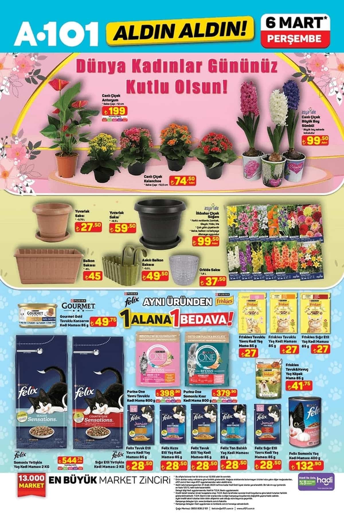 6 Mart 2025 A101 Kataloğu, özellikle 8 Mart Dünya Kadınlar Günü için özel fırsatlar sunulmuştur. Kadınlar için makyaj ürünleri, canlı çiçekler ve led ışıklı makyaj aynası (999 TL) gibi çeşitli hediye seçenekleri bulunmaktadır. Ayrıca tekstil ve mutfak ürünlerinde de indirimler mevcuttur. Kadife seccade (99,50 TL), namaz elbisesi (219 TL), yüz havlusu (54,50 TL) ve banyo havlusu (99,50 TL) gibi ürünler de avantajlı fiyatlarla sunulmaktadır.