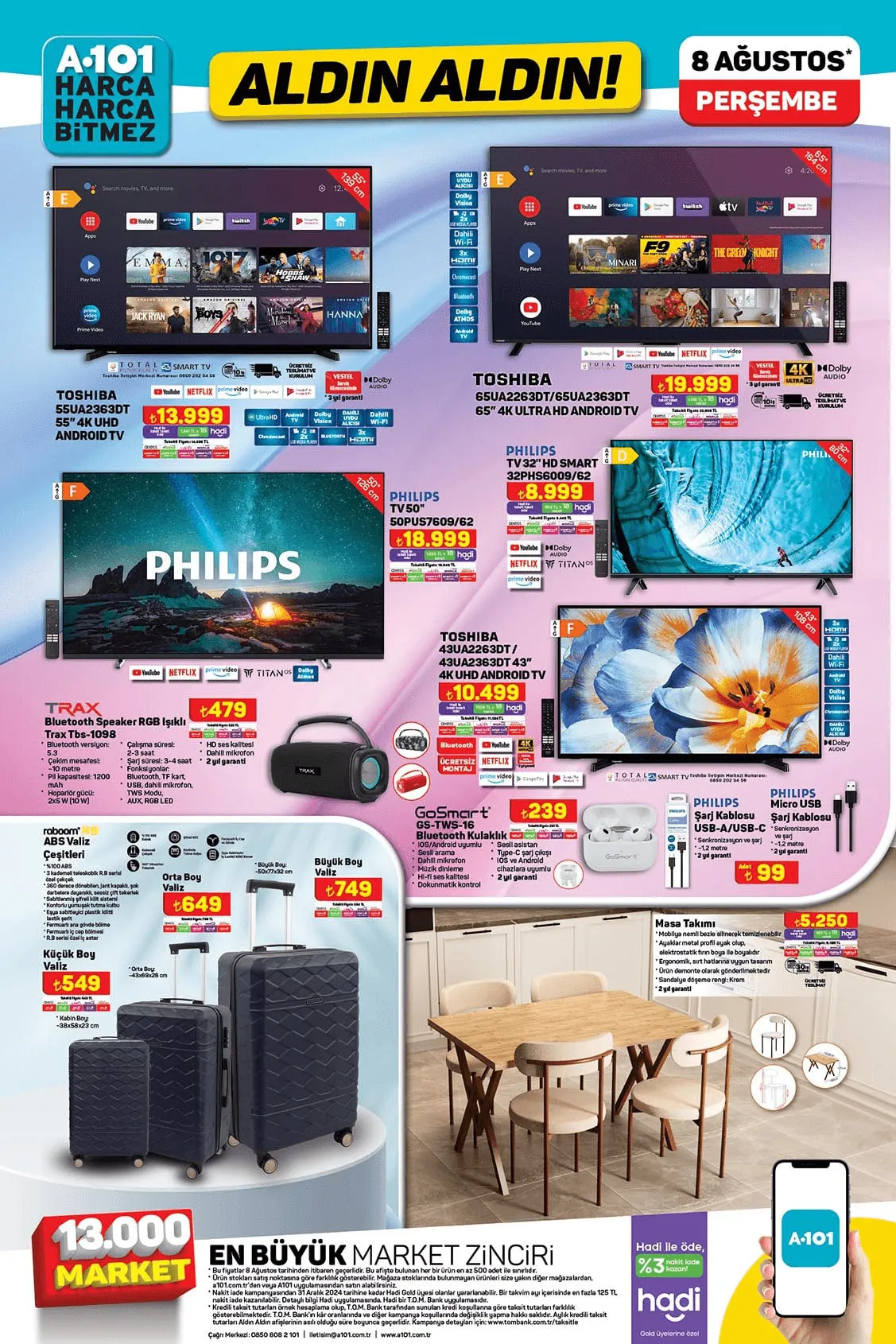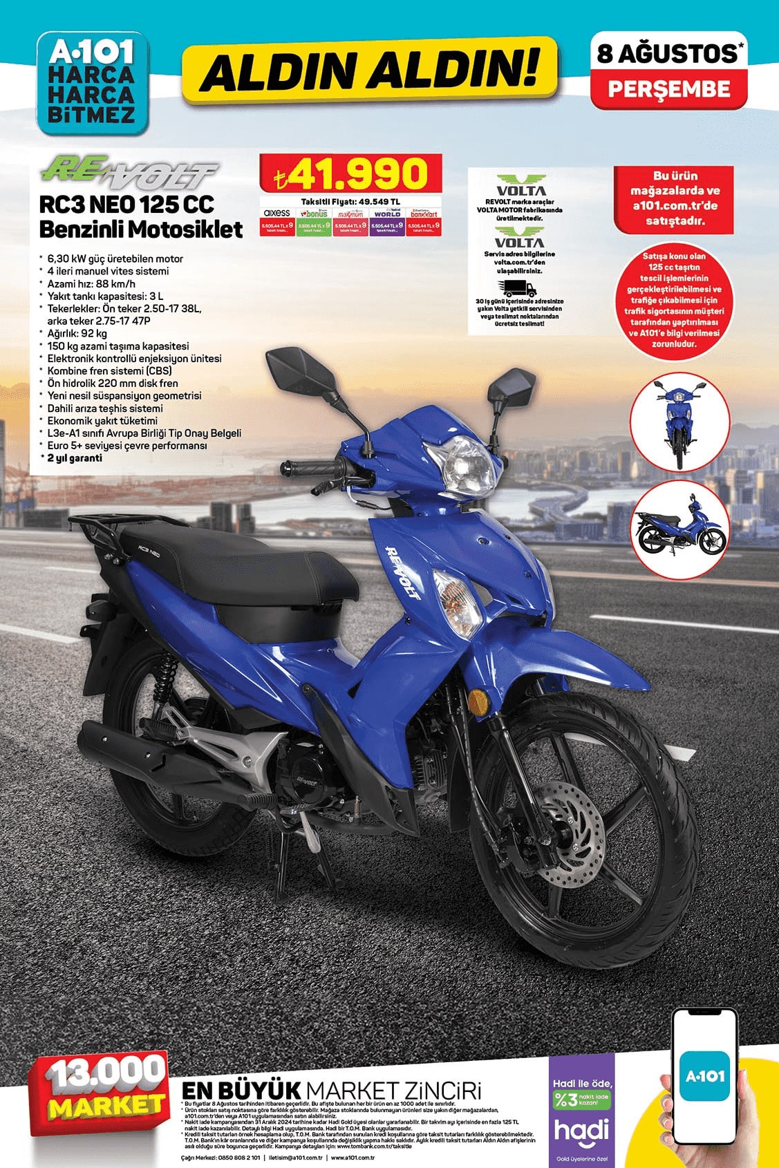 A101 8 Ağustos ile 15 Ağustos 2024 tarihleri arasında geçerli olacak aktüel kataloğunda yer alacak aktüel indirimler belli oldu. A101 8 Ağustos 2024 Perşembe Aldın Aldın kampanyasında hangi ürünler raflarında yer alacak hemen bakalım.8 Ağustos A101 Market kampanyasında ilk dikkat çeken aktüel ürün Revolt RC3 Neo 125CC Benzinli Motosiklet oluyor. A101 8 Ağustos 2024 kataloğunda Revolt RC3 Neo 125CC Benzinli Motosiklet için 41.990 TL fiyat görüyoruz. A101 8 Ağustos 2024 kataloğunda yer alan diğer aktüel ürünlere de hemen bakalım.A101 Aktüel 8 Ağustos kataloğunda Toshiba 65″ 4K UHD Android Tv, English Home Cam Çay Makinesi, English Home 16 Parça Yemek Takımı, Pirge Profil Bloklu Bıçak Seti ve Onvo Airfryer haftanın dikkat çeken aktüel ürünleri arasında yer alıyor. A101 8 Ağustos 2024 Aktüel Ürünler Kataloğu ile bu hafta gelecek tüm ürünlere sayfanın devamından ulaşabilirsiniz. A101 15 Ağustos 2024 tarihine kadar geçerli olacak A101 8 Ağustos 2024 Kataloğu ile gelecek ürünlerden öne çıkanları sizlere sunduk. Gelecek hafta Aldın Aldın kampanyasında A101 8 Ağustos 2024 Aktüel Kataloğu incelemesi yine sitemizde A101 Aktüel kategorisi altında yer alacaktır daha fazlası için bizleri takipte kalınız.
