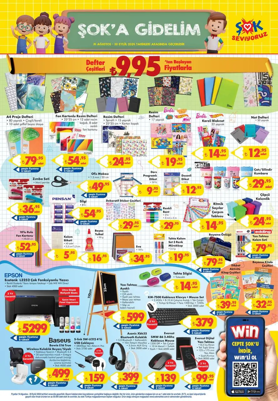 14 Ağustos 2024 ŞOK Kataloğu ile Eğitim ve Öğretim Yılının başlamasına az bir süre kala muhteşem indirimlerin olduğu okul ve kırtasıye özel kataloğunda ilk dikkat çeken ürün EPSON markası ile 2 yıl garantili ultra düşük maliyetli baskı özelliğine sahip olan Epson Çok Fonksyonlu Yazıcı 5,299 TL. üstelik bu fırsat ürünlerini Şok Kampanya avantajı ile kredi kartına peşin fiyatına taksitle alacaksınız. 14 Ağustos 2024 Şok Aktüel Kataloğu kampanya detaylarında büyük indirimlerle harika ürünleri dolu dolu olduğunu söylemiştik. İşte; Şok Aktüel 14 Ağustos 2024 kataloğu içeriğinde ki bu ürünler devamında; EVEREST markası ile 2 yıl garantili Everest Dijital Yazı Tahtası 99,95 tL. Everest Kablosuz Klavye Mouse Set 379 TL. Asonic Bluetooth Kulaklık 399 TL. Kablosuz Mouse 139 TL. S-Link USB Çoklayıcı 159 TL. lik indirimli fiyatları kredi kartına peşin fiyatına taksit imkanı ile 30 Eylül 2024 Çarşamba gününe kadar Hem Şok’ta Hemde Cepte Şok’ta satışa sunulacak olan Şok Aktüel Ürünleri diyebiliriz.